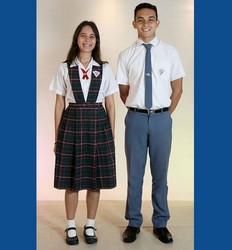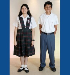 Niños: camisa blanca de manga corta con la insignia del COLEGIO cosida en el bolsillo izquierdo. Pantalón corto, color, el asignado por el Colegio, correa negra y zapatos negros de cordones, medias azul oscuro. Para paseos y días especiales: suéter rojo con el logo establecido por el COLEGIO y pantalón buzo azul marino con franja blanca a los lados.